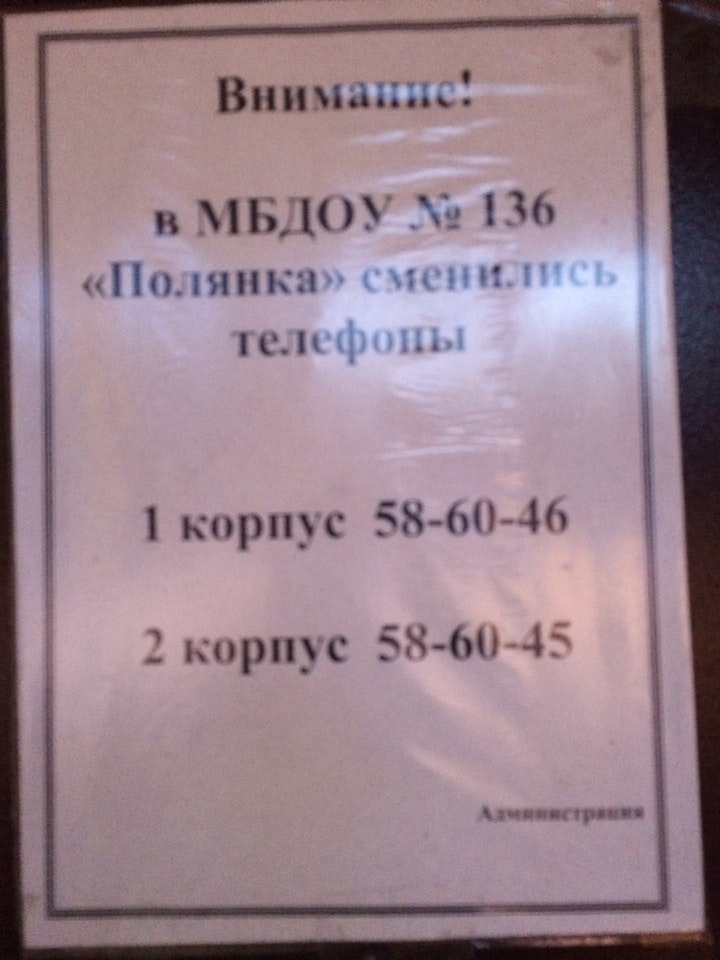Бывает, что люди ищут этот детский сад как Детский сад №136 «Полянка». Мы стараемся поддерживать всю информацию о «Детский сад №136 Полянка» в актуальном состоянии. Если вы обнаружили неточность или ошибку, пожалуйста, исправьте ее.